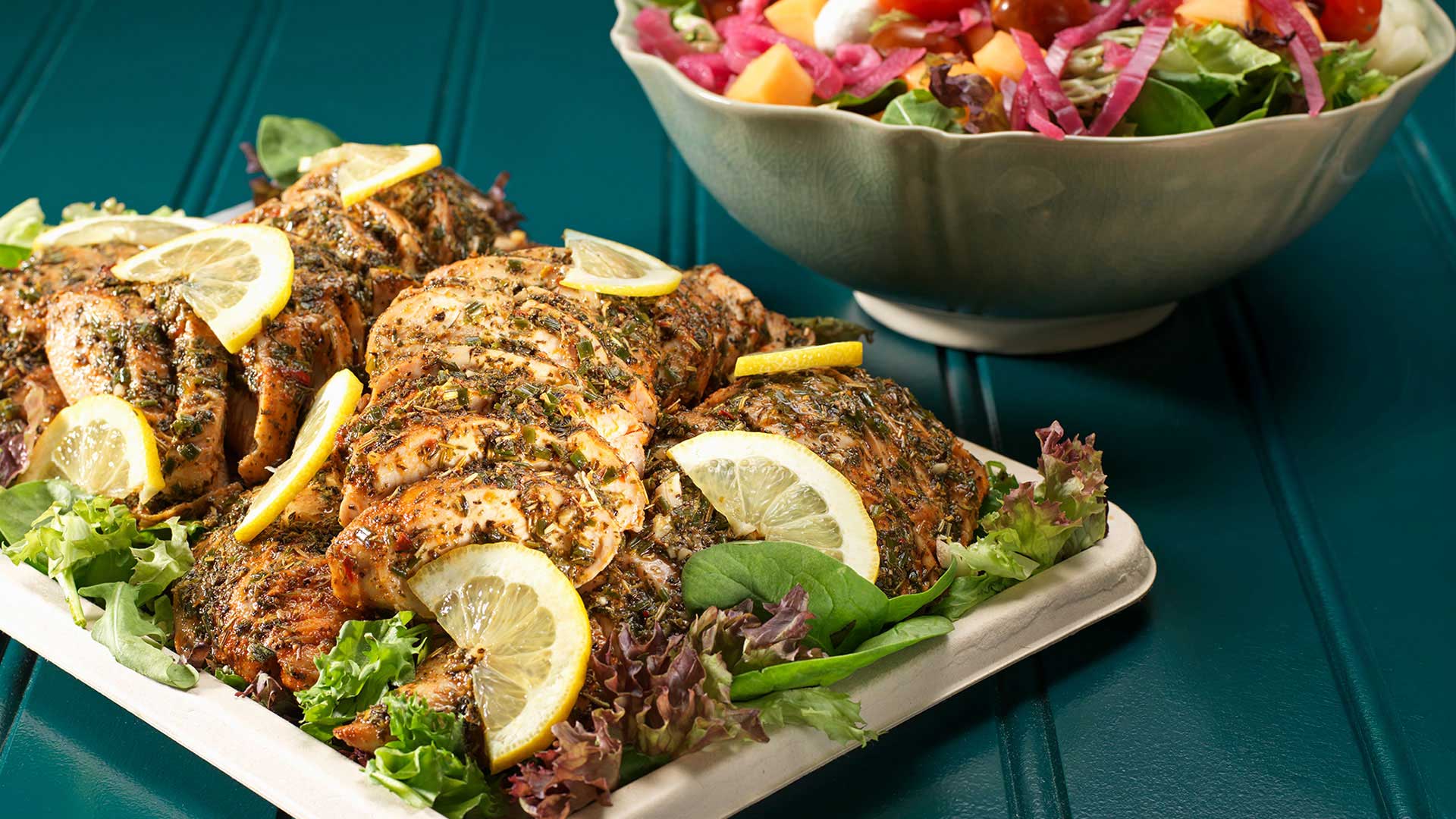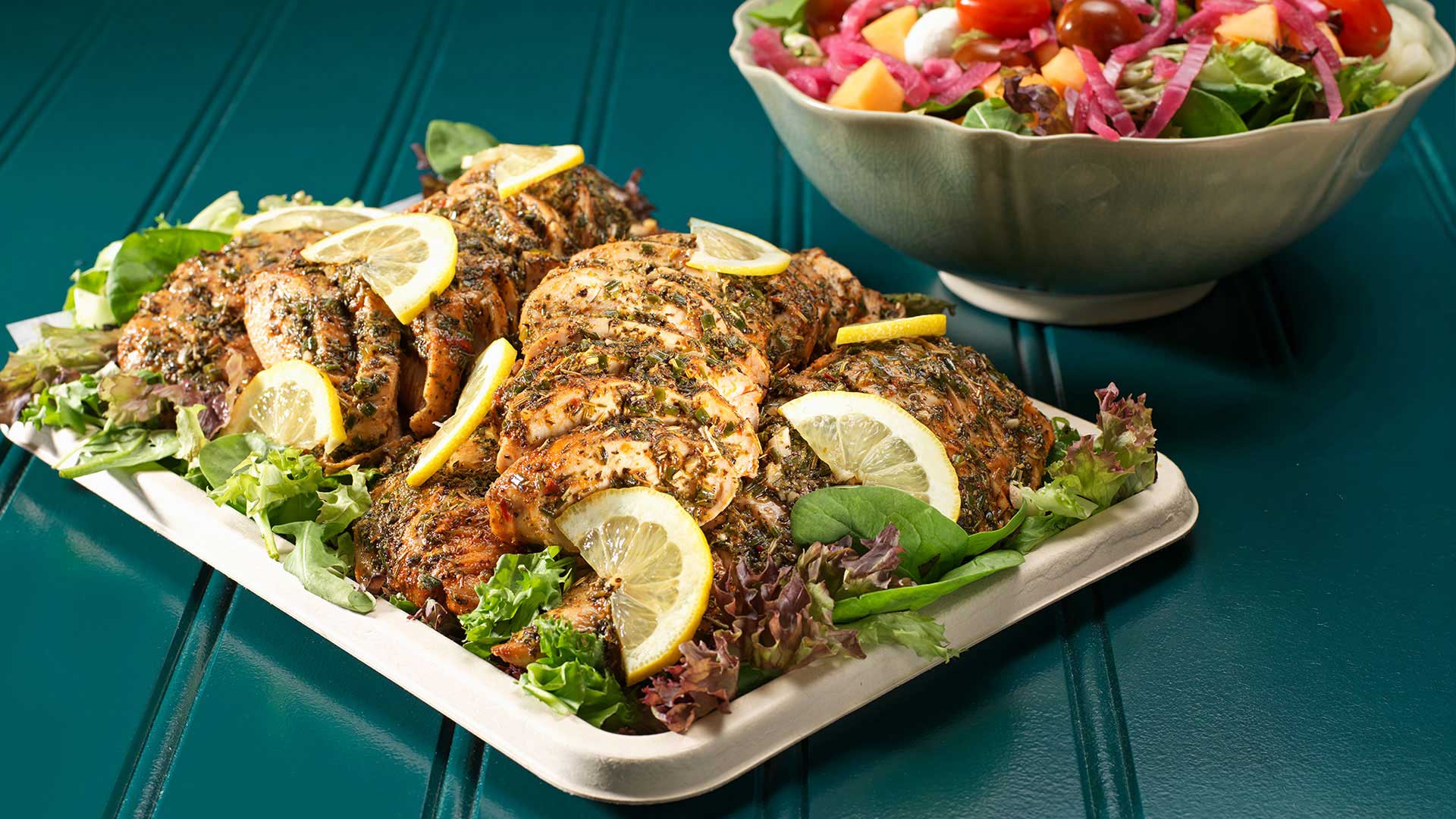 - Dubbelmarinerad kalkonbröstfilé - Fetaostkräm - Färgglad sallad med cocktailtomater, melon, syrad rödlök & mozzarellabollar Dessutom ingår ett av våra goda tillbehör. Välj mellan: Potatisgratäng, potatissallad eller ugnsstekt potatis Allergisk? Fråga oss om matens innehåll.