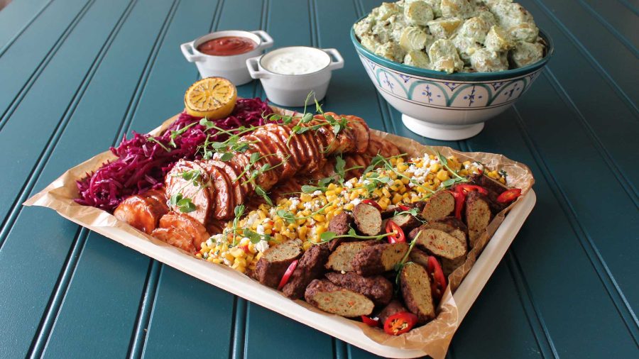 - Barbequeglazead kalkonbröstfilé - Kalkoncevapcici - Majssalsa - Picklad rödkål - Örtig potatissallad - Vitlökssås - BBQ-sås Allergisk? Fråga oss om matens innehåll.