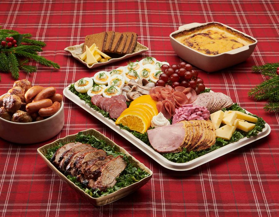 - Ägg med dillmajonnäs - Sill - Griljerad julskinka av kalkonlår med senapskräm - Kallrökt kalkonkorv - Ingelstasylta av kalkon - Rödbetssallad - Kalkonköttbullar - Kalkonetter (prinskorv av kalkon) - "Kalkonrevben" - Janssons frestelse med kalkonbacon - Kavring & smör - Lagrad svensk hårdost - Dekorerat med röda vindruvor, apelsin och grönkål Allergisk? Fråga oss om matens innehåll.