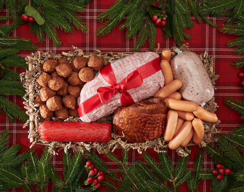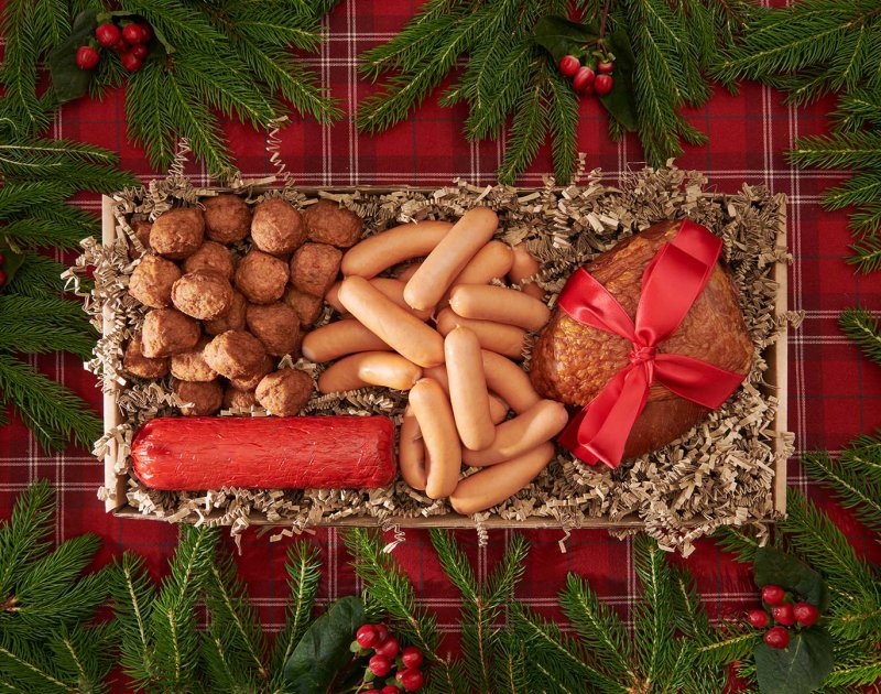 Jullåda mellan innehåller 1 styck Julskinka av kalkonlår, 1 förpackning Kalkonköttbullar, 1 förpackning Kalkonetter (prinskorv av kalkon), 1 st Kallrökt kalkonlökkorv, 1 st Picknicklår av kalkon, 1 st Ingelstasylta. Packas i wellkartong. Lådans totalvikt är ca 2,99 kg